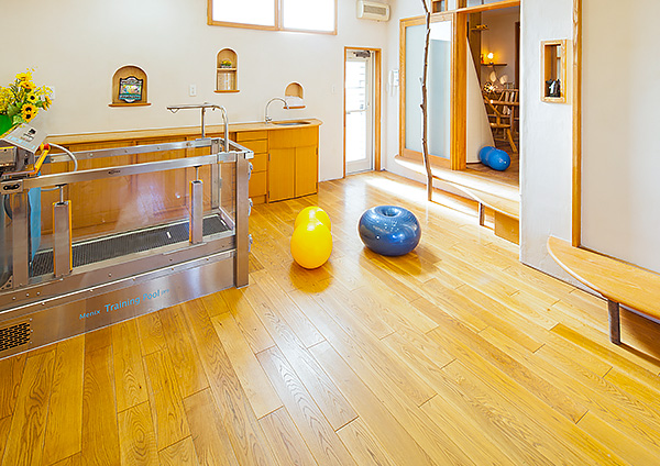 ケアセンターリハビリ室ここではリハビリ、ドッグマッサージ、トレッドミルの他にセミナーやしつけ教室など多目的に使用しております。